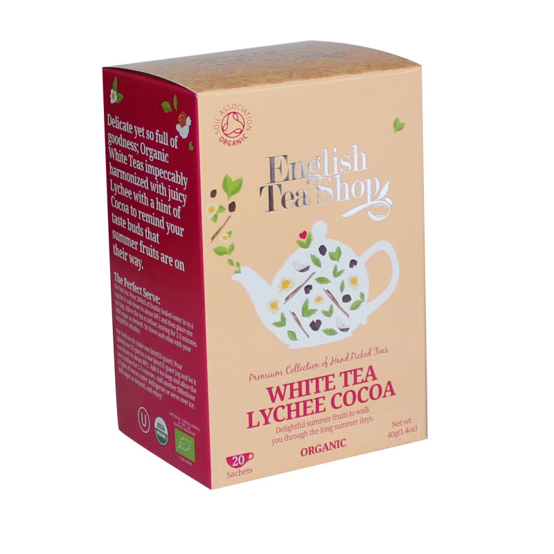 Bílý čaj má lahodnou čistou chuť a obsahují antioxidanty, které zpomalují stárnutí. Má jemně zelenou barvu a velmi lehkou a svěží chuť, která má povzbuzující účinky. Bílý čaj se zpracovává z mladých nerozvinutých lístků, které se suší na slunci. Kakao posiluje organismus a funguje jako afrodiziakum. Liči je považováno za pokrm lásky a nejjemnější ovoce.