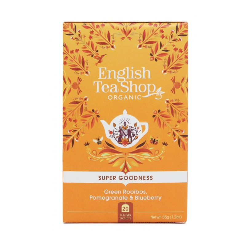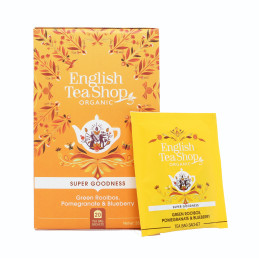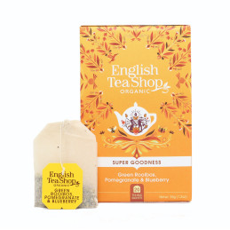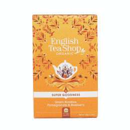 Čaj Zelený Rooibos, granátové jablko a borůvka v bio kvalitě od značky English Tea Shop vás potěší svou sladkou medovou chutí. Díky kombinace granátového jablka, ibišku a borůvek má čaj ovocnou chuť s dávkou antioxidantů. Čaj je zcela bez kofeinu a je vhodný pro děti, těhotné a kojící ženy.